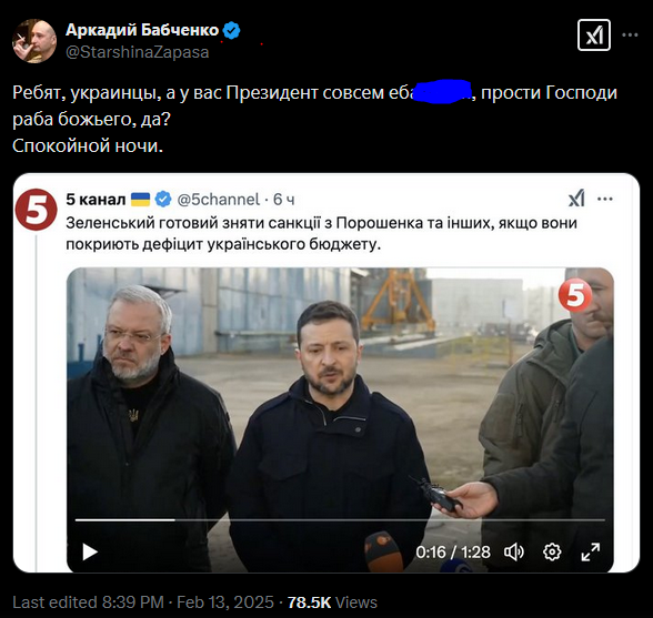 Тем временем, Рейтерс сославшись на три анономных источника, пишет, что Маск пригрозил отключить ВСУ от Старлинков, если Украина не подпишет соглашение по редкоземам. И вроде Зеленский подпишет документ не позднее понедельника.
