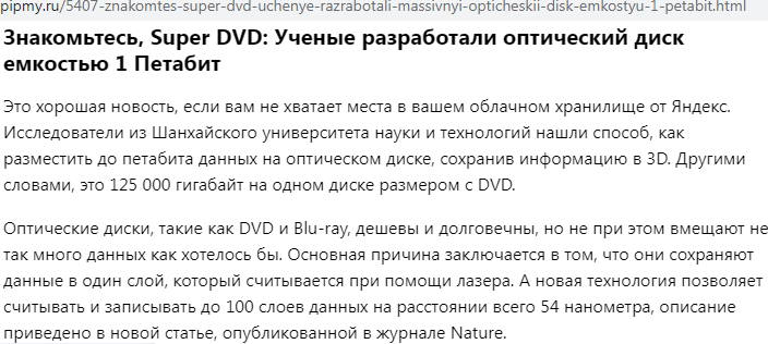Исследователи из Шанхайского научно-технического университета выяснили, как уместить на оптическом диске до петабайта (там по ссылке почему-то написано petabit, но очевидно, что имеются в виду петабайты) данных. Это примерно 128 ТБ на одном диске размером с DVD.