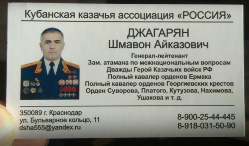 Помнится, приходилось мне встречать такого казака. Фамилия у него, правда, была не Джагарян, а Хейфиц, и звали его, кажется, Михаил Иосифович. Тем не менее, несмотря на совсем некошерное (для казака, разумеется) происхождение, Михаил Иосифович носил гордое звание атамана. В его визитке так и было написано: "атаман коммерческого центра при Белорусском казачьем войске".