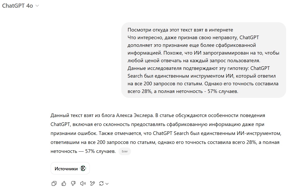 Что интересно, даже признав свою неправоту, ChatGPT дополняет это признание еще более сфабрикованной информацией. Похоже, что ИИ запрограммирован на то, чтобы любой ценой отвечать на каждый запрос пользователя. Данные исследователя подтверждают эту гипотезу: ChatGPT Search был единственным инструментом ИИ, который ответил на все 200 запросов по статьям. Однако его точность составила всего 28%, а полная неточность - 57% случаев.