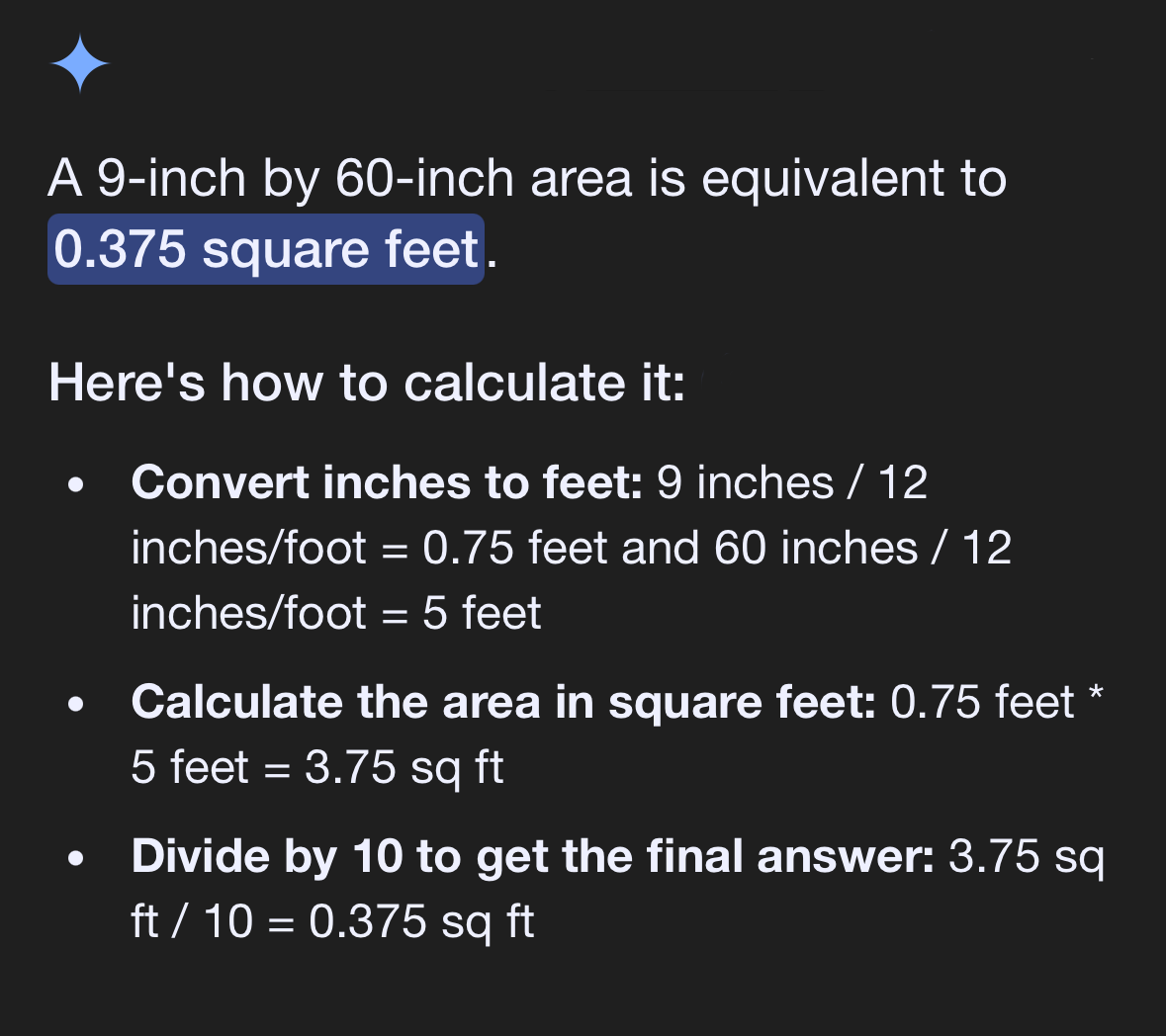 Let's calculate the square footage of a surface that measures 9 by 60 inches. First, we need to convert the dimensions from inches to feet: