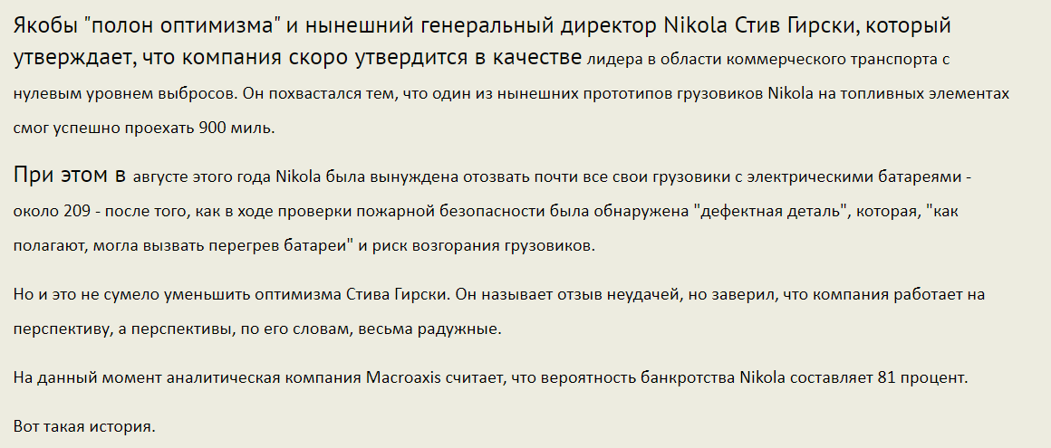 Якобы "полон оптимизма" и нынешний генеральный директор Nikola Стив Гирски, который утверждает, что компания скоро утвердится в качестве лидера в области коммерческого транспорта с нулевым уровнем выбросов. Он похвастался тем, что один из нынешних прототипов грузовиков Nikola на топливных элементах смог успешно проехать 900 миль.