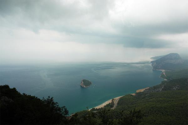 Я не знаю, как объяснить с физической стороны, но между этим островом и материком там довольно сильное течение (на фото справа налево, то есть со стороны Кемера). Прогулочный катер стоял на якоре, а туристы вплавь поплыли осматривать одну из пещер на берегу. Так вот возвращение на кораблик было довольно проблематичным, поскольку течение все время относило пловцов от кораблика. Я, пока доплыл до яхты , весь вымотался, да и то пришлось воспользоваться спущенным с корабля длинным канатом, а за одной из молодых немок пришлось турецкому матросу прыгать в воду и помогать ей доплыть до этого каната.