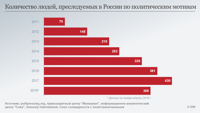 Сейчас в России, по разным оценкам, более 300 человек подвергаются преследованию по политическим мотивам. В реальности, утверждают правозащитники, эта цифра гораздо выше. Термин "политическое преследование" - оценочный, так как официально в УК России нет политических статей. Кого считать политзаключенным - решают правозащитные организации, в том числе международные."