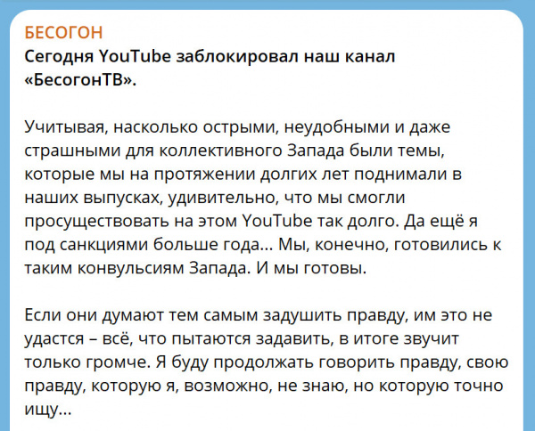 Youtube закрыл бесогонский канал Михалкова.