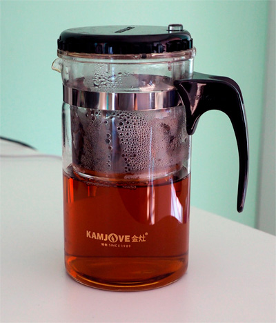 С чаями - все сложнее. В статье "Как правильно заваривать хороший чай" я рассказывал о том, как сам завариваю чай. А именно - вот в таком простеньком китайском чайничке Kamjove, где чай засыпается в верхний сосуд, а после заваривания сливается вниз в чайник. (Кстати, выяснил, что в России эти чайники тоже стали продаваться.)