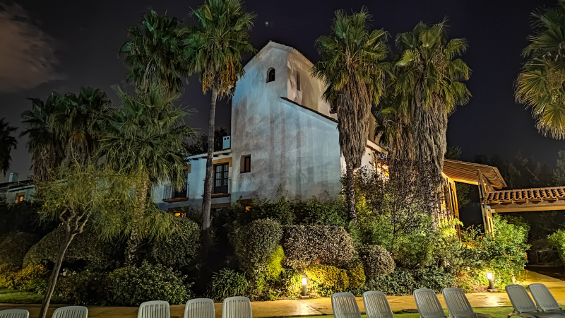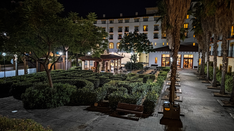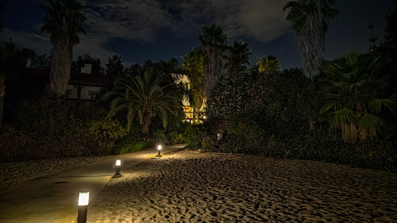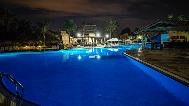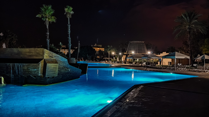 Бассейн и территория отеля ночью.