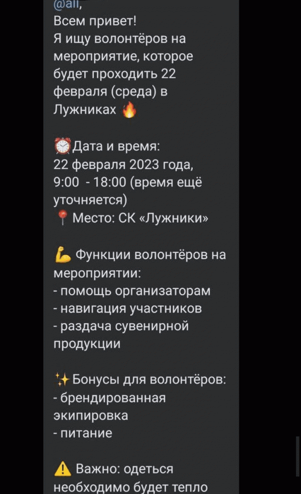 На мероприятие уже приглашают патриотичную молодежь, как выяснило издание Sota. Денег, правда, не обещают вообще, потому что денег нету. Но зато обещают "брендированную экипировку" (счастье-то какое) и вроде как дадут какой-то пирожок сожрать. В общем, соблазнительно, да.