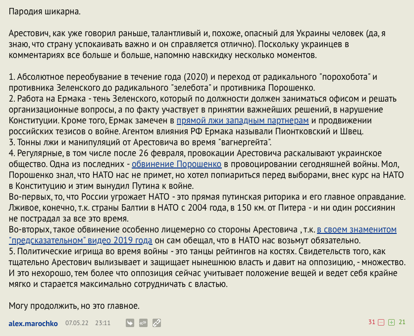 Я, честно говоря, Арестовича не смотрю и не слушаю примерно с того момента, как Фейгин с ним расстался. А точнее с того момента, как Арестович вдруг объявил о своих "президентских амбициях" и под эти амбиции начал выдавать ТАКОЕ, что хоть стой хоть падай. И мне эту пургу слушать уже было совершенно неинтересно, поэтому я и не слушал.