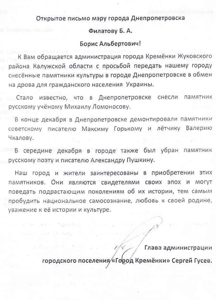 Рад за тех, кто видит в ответе юмор и смысл отвечать вообще. Я не вижу ни того, ни другого. Ответ является лишь прекрасным поводом для пропагандонов заявить, что "Днепропетровск так остро нуждается в топливе, что власти готовы обменять советские памятники на дрова", махая текстом документа. А если аккуратно убрать с картинки текст в скобках в предпоследнем абзаце, то заодно можно обвинить в вандализме и извращенном садизме. Ну там еще и что они признают Запорожье не совсем украинским городом, поскольку соглашаются на обмен, используя его в качестве нейтральной территории.Дальше мне лень за них думать, но, уверяю, при желании надумают ещё. Такие писульки следует игнорировать как класс.