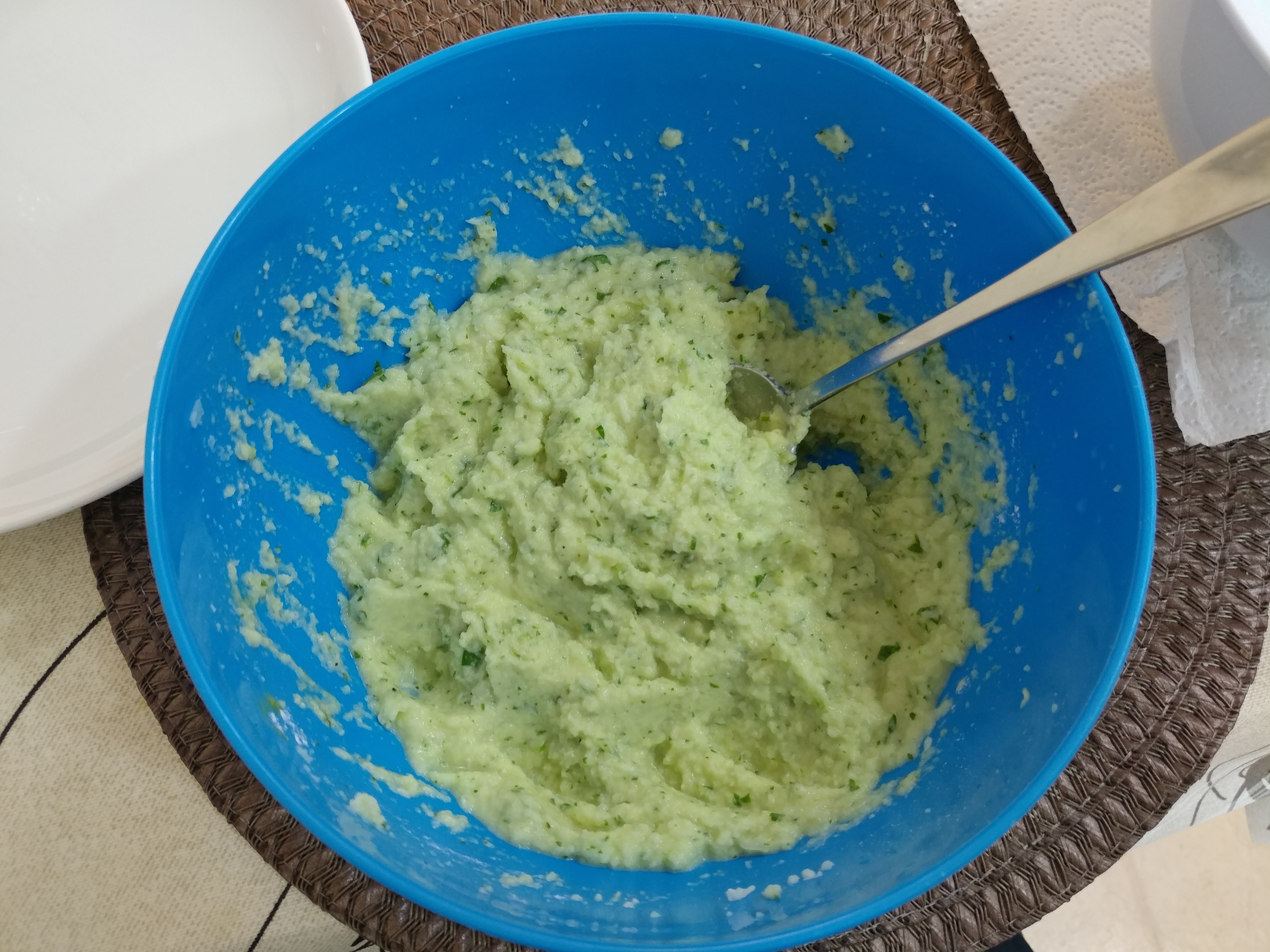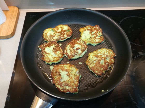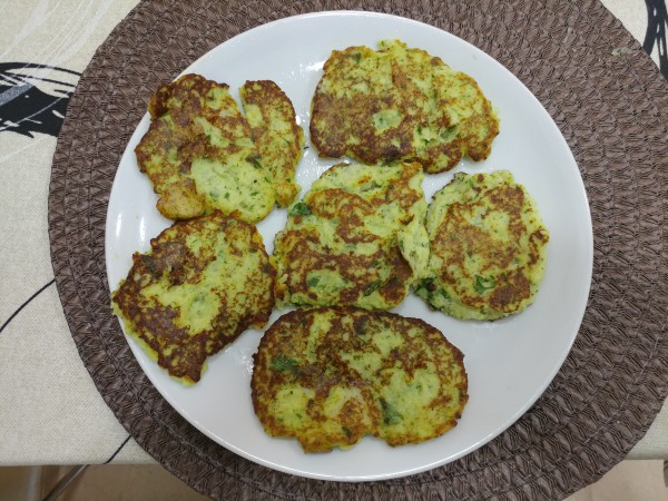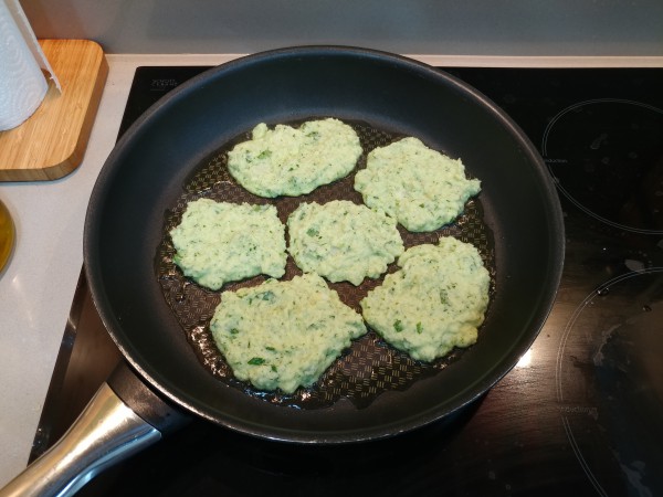 И теперь можно ложкой выкладывать аппетитно зеленеющую массу на разогретую сковородку с небольшим количеством оливкового масла и жарить до готовности, регулируя желаемую степень прожарки.