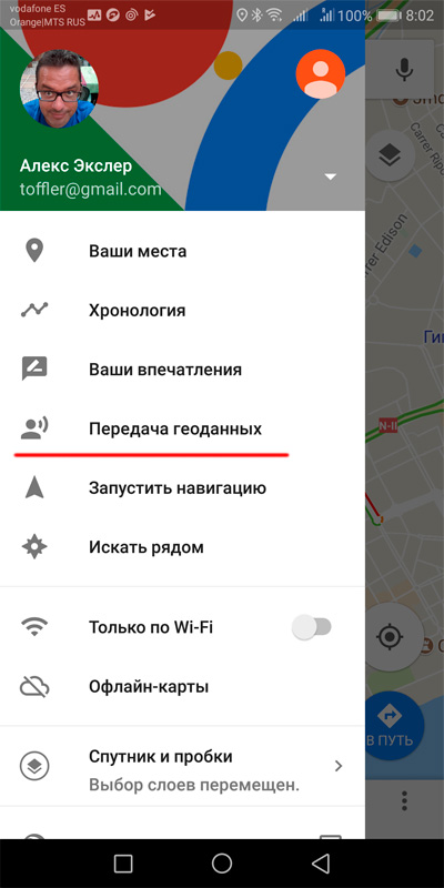 Подключается это все следующим образом. Заходите в меню (значок слева сверху). Там находите "Передача геоданных".