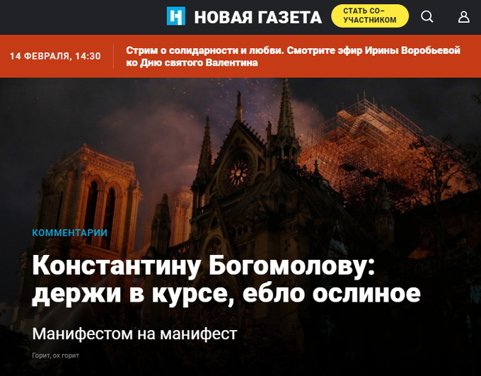 Можно соглашаться или спорить с Богомоловым, но это действо достойно школоты. О.К. "Новая газета".