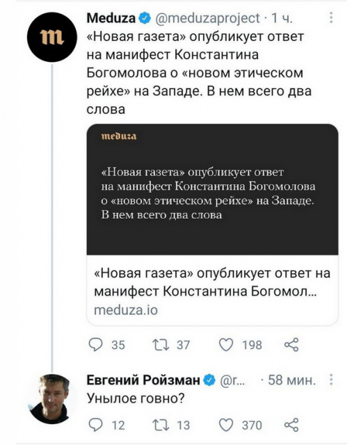 Почему это опубликовала "Новая"? Ну, Муратов же не дурак. Они, во-первых, сделали приписку, что мопед вообще ни фига не их, а это типа как просто приглашение к диалогу. А, во-вторых, Муратов прекрасно понимает, что хайп - наше все! А что статейка безумно хайповая, и что ее прочитают буквально все - это было сразу понятно. Мог ли он отказаться ее печатать? Нет, не мог и не имел права как главный редактор.