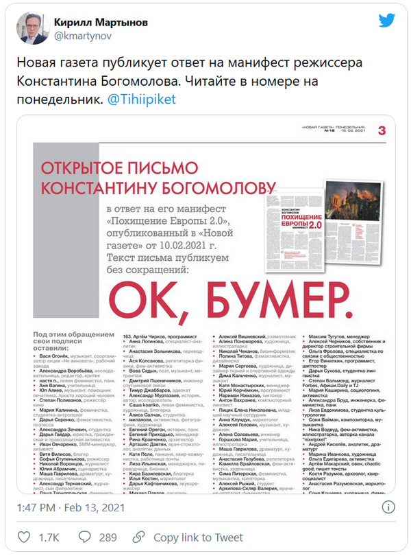 Толково по теме:www.gazeta.ruПосле публикации своего манифеста Богомолов сразу становится объектом внимания всего медийного спектра – то есть его публичный вес возрастает, у него берут интервью, уточняют позицию, приглашают на ток-шоу, а пресс-секретарь президента Песков великодушно роняет что-то про свободу каждого высказывать свое мнение.