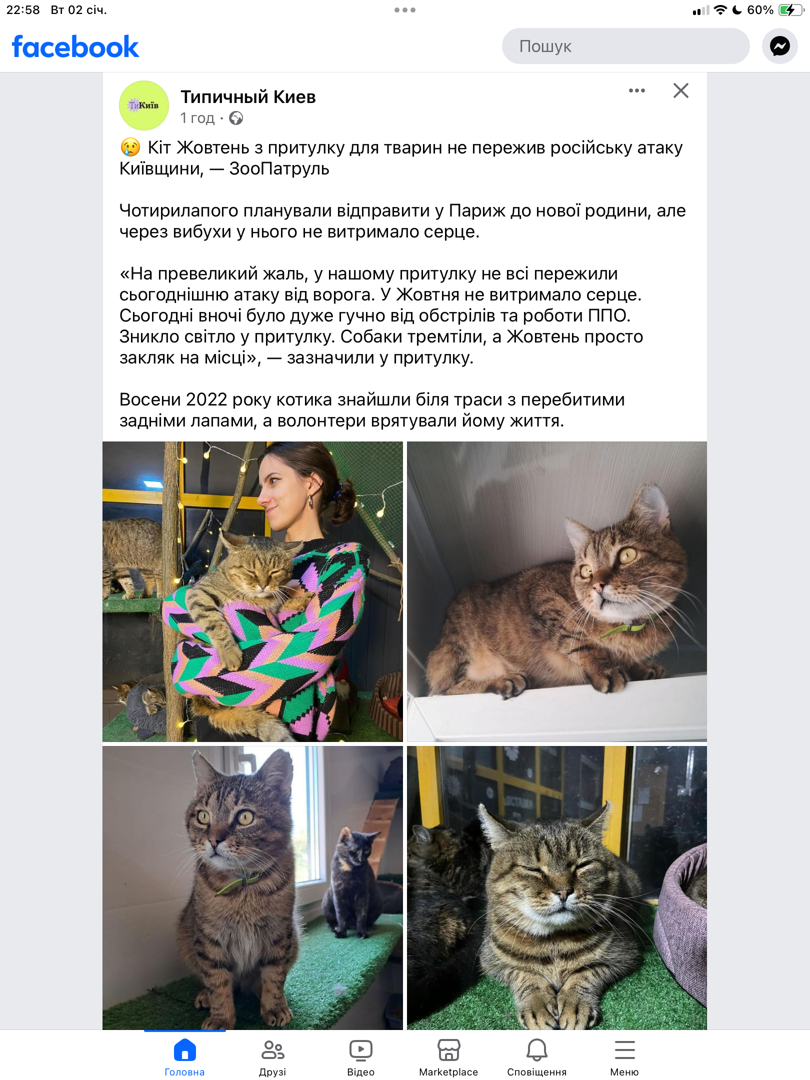 А еще у нас так. Кот Жовтень (рус — Октябрь) должен был ехать из приюта в новую семью в Париж, но сегодня из-за взрывов у него остановилось сердце.
