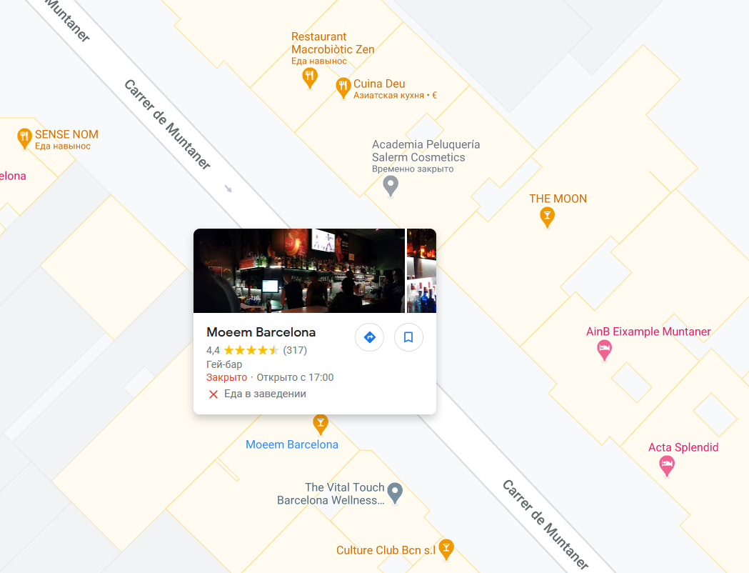 Я открыл карты Гугла - а и действительно: если просто вывести эту зону, то он в ней не показывает ресторан Arrosseria Xàtiva, зато показывает заведение напротив через дорогу, которое действительно оказалось гей-баром, как сообщил Гугл. Прикольно получилось.