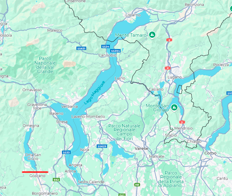 Озеро д'Орта (Lago d’Orta) - небольшой водоем, расположенный на севере Италии в Пьемонте недалеко от крупного озера Маджоре. Вот я на карте отметил красным озеро д'Орта, за ним идет Маджоре, а за ним - озеро Комо. И все это совсем рядом с границей Швейцарии.