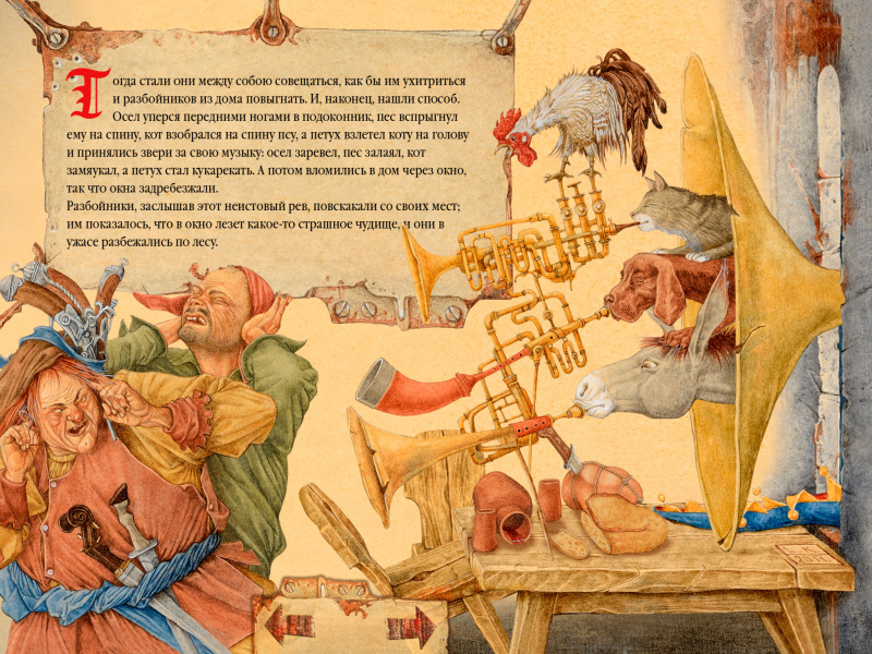 Речь идет об интерактивной сказке братьев Гримм "Бременские музыканты", которая продается в AppStore за $0,99. И это не просто иллюстрированная сказка, это живая книга, в которой более 800 анимационных эффектов, то есть на каждой странице можно прикасаться к различным предметам, а они на это будут реагировать. Иллюстрации и анимацию создал известный иллюстратор Лев Каплан (он работает в России и в Германии), текст сказки начитывал очень хороший актер Михаил Горевой.