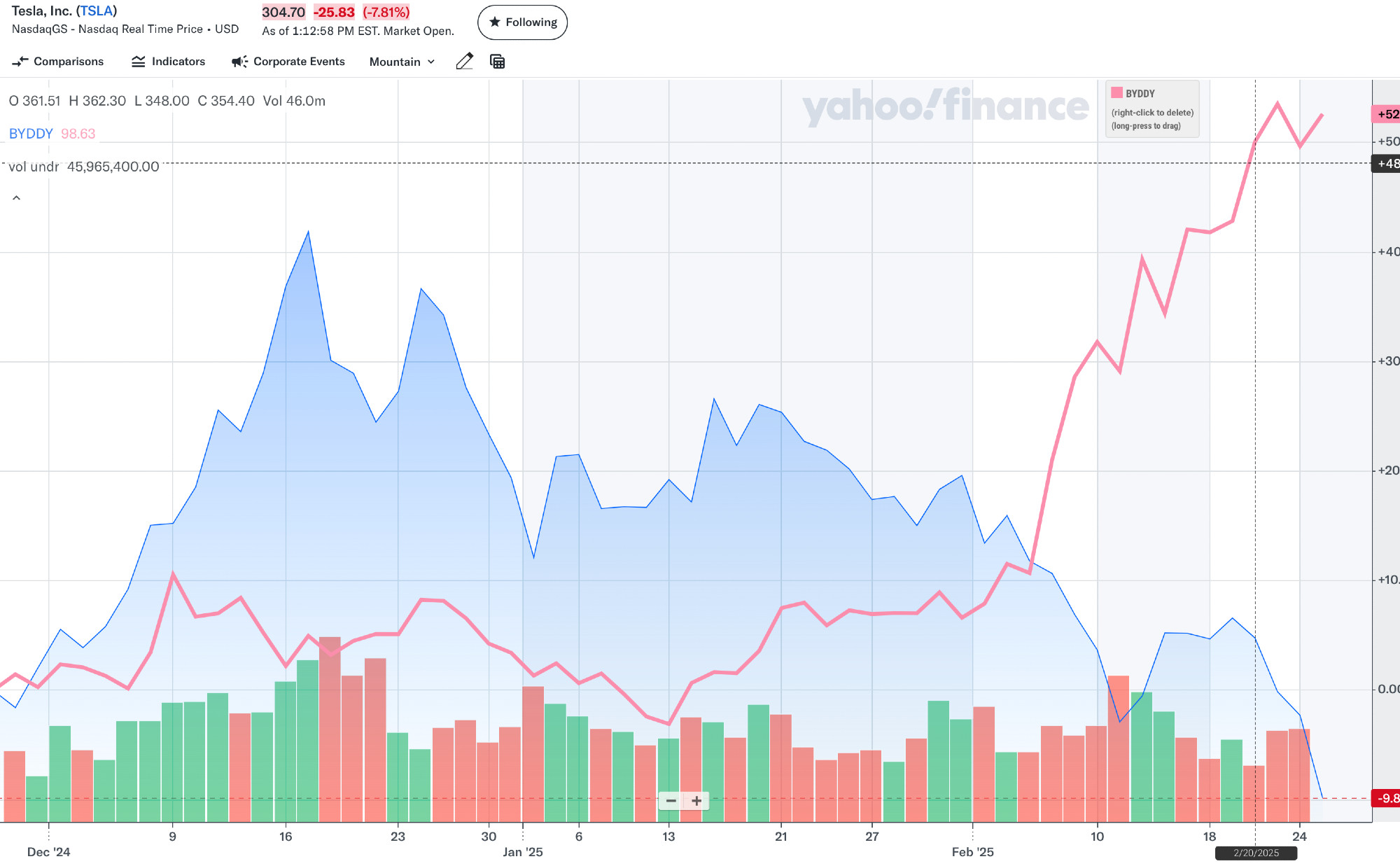 Т.е. за тот же промежуток времени с 1 декабря 2024 по 24 февраля 2025 стоимость акций Теслы упала где-то на 10%, стоимость акций BYD выросла на 30%. При этом, пока Маск не был столь активен в своих фашистских выходках, и не высказывался публично по поводу AfD, и не увольнял всех подряд в американских гос структурах, все было более-менее нормально. Shit happened в начале февраля. Так что coloring of the facts в статье тоже не с потолка.