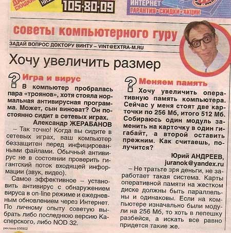 У нас в Томске в местной околокомпьютерной газетенки примерно такие же советы дает "Роман Ответов". Впрочем, такого стёба там не проскакивало 😉