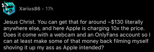 Господи. Вы можете приобрести его за ~$130 буквально в любом другом месте, а здесь Apple берет в 10 раз дороже. А есть ли в комплекте веб-камера и аккаунт на OnlyFans, чтобы хотя бы часть этих денег вернуть, снимая как ты засовываешь эту память себе в задницу, как это, видимо, задумано Apple?