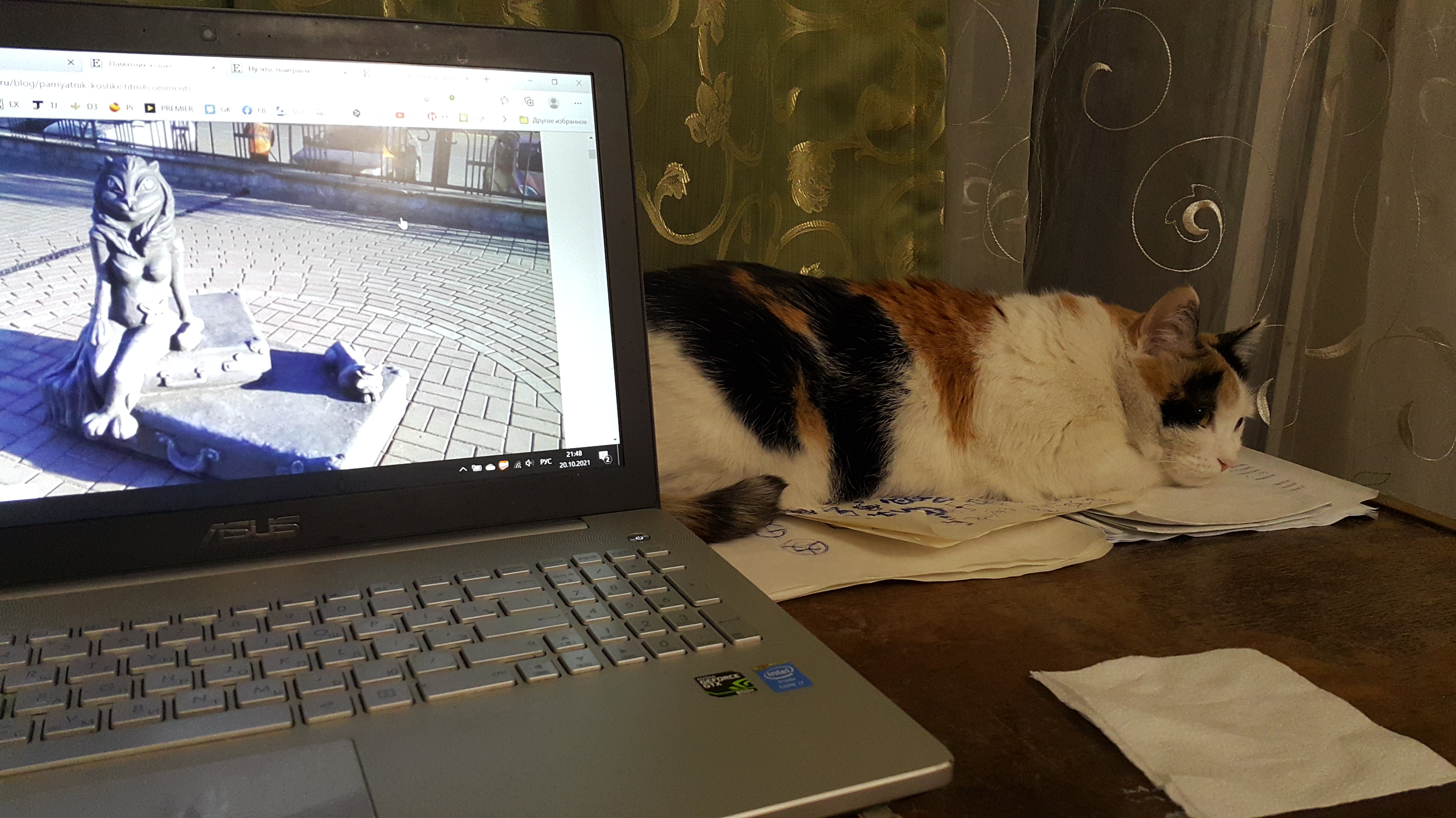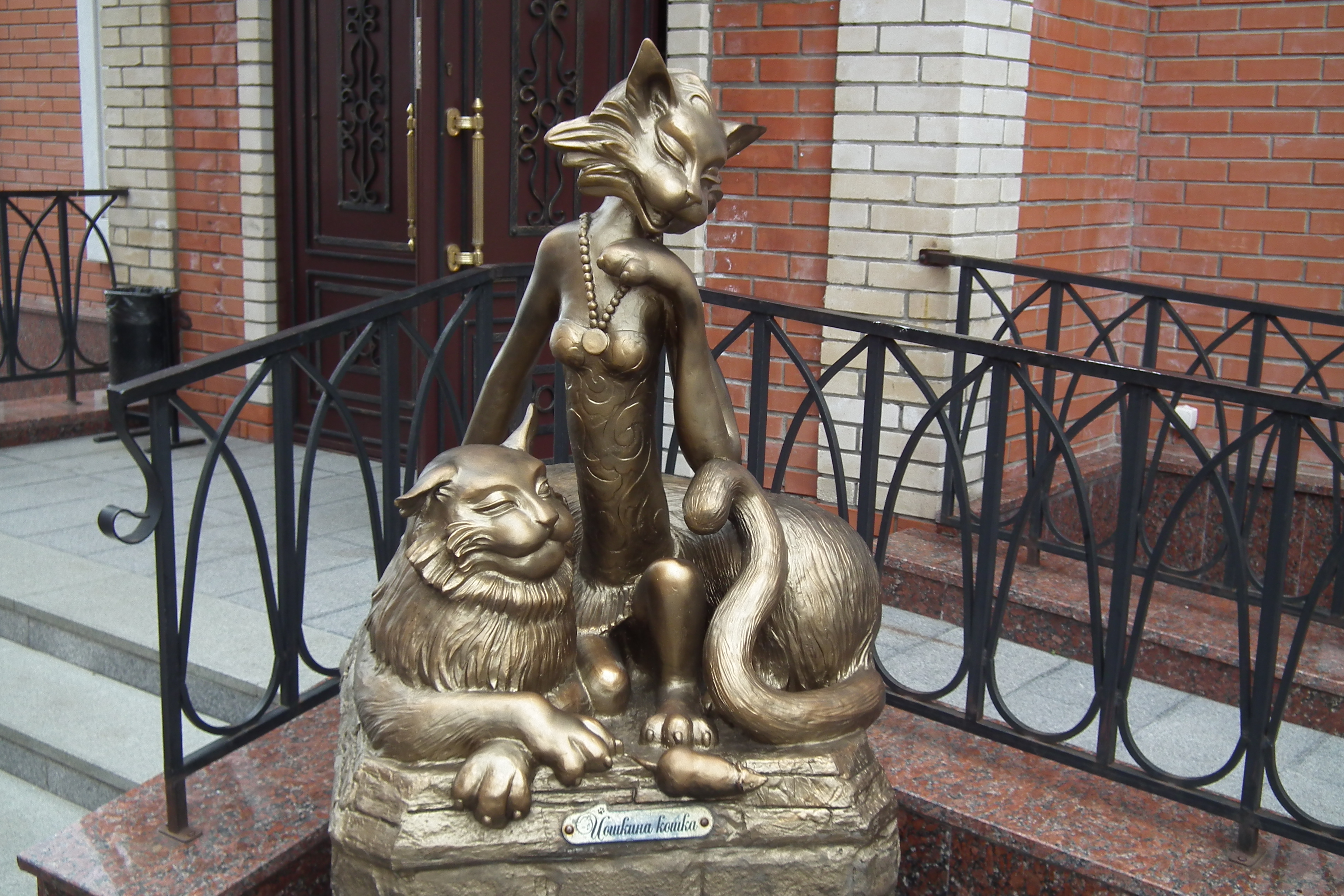 Я не понял проблемы. На памятнике - кошка (справа, на уголке чемодана, если кто не видит 😄). А рядом сидит женщина-кошка, украшая собой пейзаж 😄