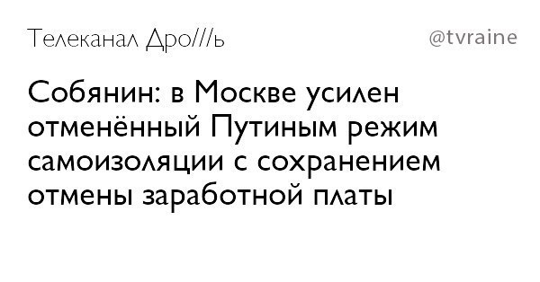 В Москве ничего не отменяется. Режим изоляции продлен до 31 мая. Теперь Собянин, который хоть что то пусть криво и косо в меру своих сил пытается что то сделать, будет во всем виноват, а Путин дал денег и выпустил народ. Я не то чтобы любитель Собянина, но Путин в данном случае наиболее омерзительно выглядит.