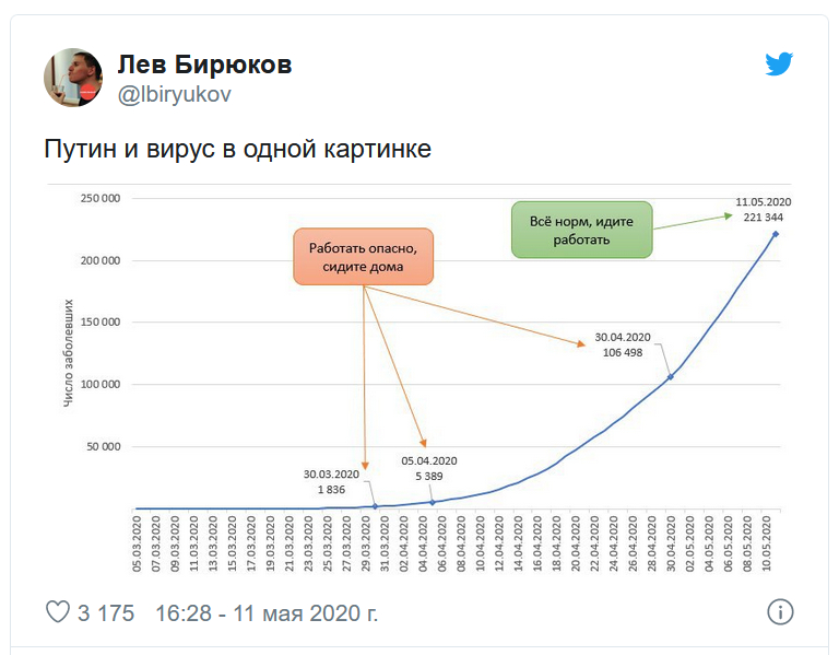 Не, не так. Во-первых логики нет у Пу - см график в посте Алекса. Во-вторых, регионы сами продлевают "карантин" до 31.05, при котором почти никто не работает. Но губерноторы в отличии от Пу при этом не заявляют "нерабочие дни с сохранением ЗП", т.е. в каком-нибудь Челябинске, бюджетники будут сидеть дома, но ЗП уже не получат.И теперь у нас оба варианта в действии: "а как мы будем жить, на что нам есть, пить и т.д. и т.п." + "Да как он посмел, у нас столько заболевших..."