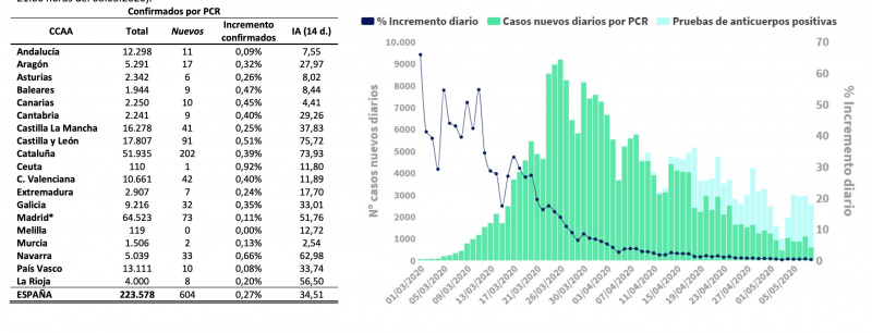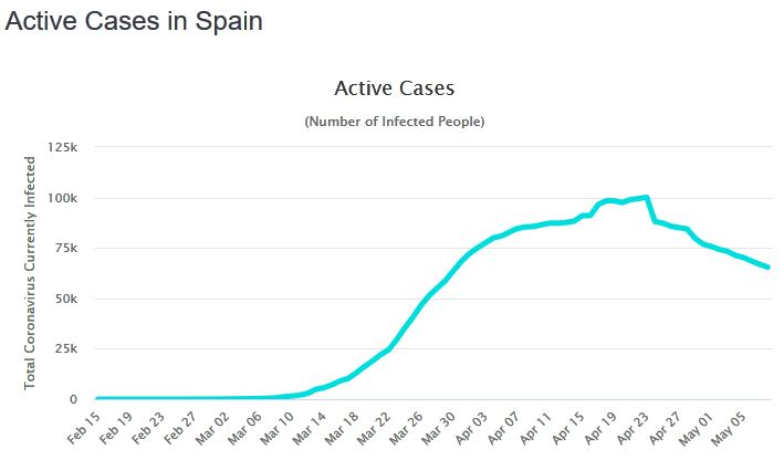 У нас за сегодня на всю Испанию 604 новых заболевших и обнаружено две тысячи человек с антителами, которые переболели раньше, всего стало быть 262 783 человека переболели или болеют, из них у 223 578 диагноз был поставлен в активной фазе, а у 38 605 по исследованию на антитела после того, как они выздоровели. За сутки умерло 179 человек, госпитализировано 479, из них в ОРИТ 70. Всего за всю эпидемию, через госпитализацию прошло 122 265 человек, из них через ОРИД 11 292. В настоящий момент в больницах с диагнозом Ковид находятся 1741 человек. Выздоровело за сутки 4749 человек. Всего с больных диагнозом ковид в настоящий момент на территории Испании 65 410 человек. Больным считается любой, к кого был тестом сперва ковид диагностирован, потом прекратились его симптомы, потом был сделан тест на ковид ещё раз и он не выявил вируса, а потом прошли ещё две недели после этого. И вот только тогда, бывший больной регистрируется в статистике как здоровый. (Отсюда.)