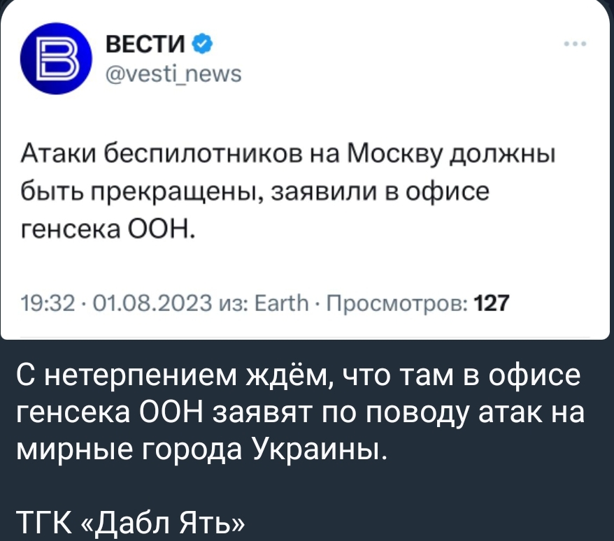 И вот теперь ООН проснулась! Теперь, когда пара дронов (опять) прилетела в небоскреб "Москва-Сити" (ночью, чтобы не убить никого из гражданских)! Вот теперь ООН выступила против атак на гражданские объекты, и они были тверды в этом заявлении! Заместитель представителя генерального секретаря ООН выступил против атак на гражданские объекты. Ну, это же "Москва-Сити", понимать надо, чего там жилые кварталы на какой-то там Украине, которые обстреливают постоянно уже полтора года, правильно? ООН мелкими проблемами не занимается, только глобальными!