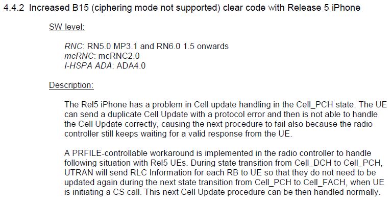 Несоответствие стандартам и спецификациям 3GPP, из-за которых, начиная с iPhone 3G, нам, операторам мобильных сетей, приходится использовать по нескольку костылей в программной части радио контроллеров почти для каждой модели "яблока". Чтобы эта хрень, простите мне мой русский, могла сносно работать.