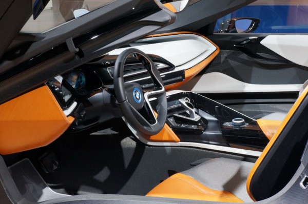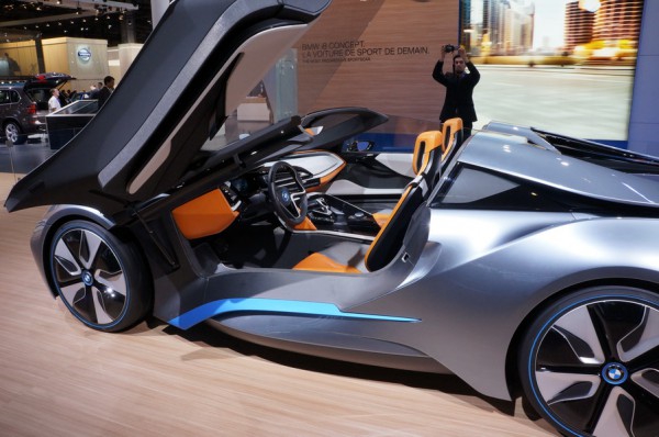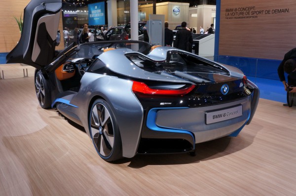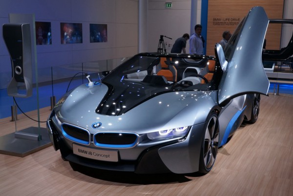 Гибридный суперкар BMW i8. Суммарная мощность силовой установки - больше 350 лошадиных сил. Это 1,5-литровый бензиновый турбодвигатель и электродвигатель в 130 лошадей. На рынок его планируется вывести в 2014 году, стартовая стоимость - 100 тысяч евро.