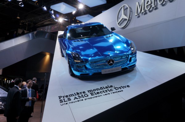 Следующая машина - Mercedes-Benz SLS AMG Coupe Electric Drive - также смотрится как произведение искусства, однако это вполне реальный электрический суперкар.