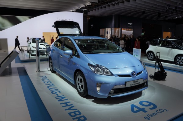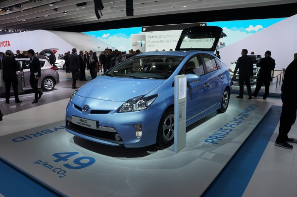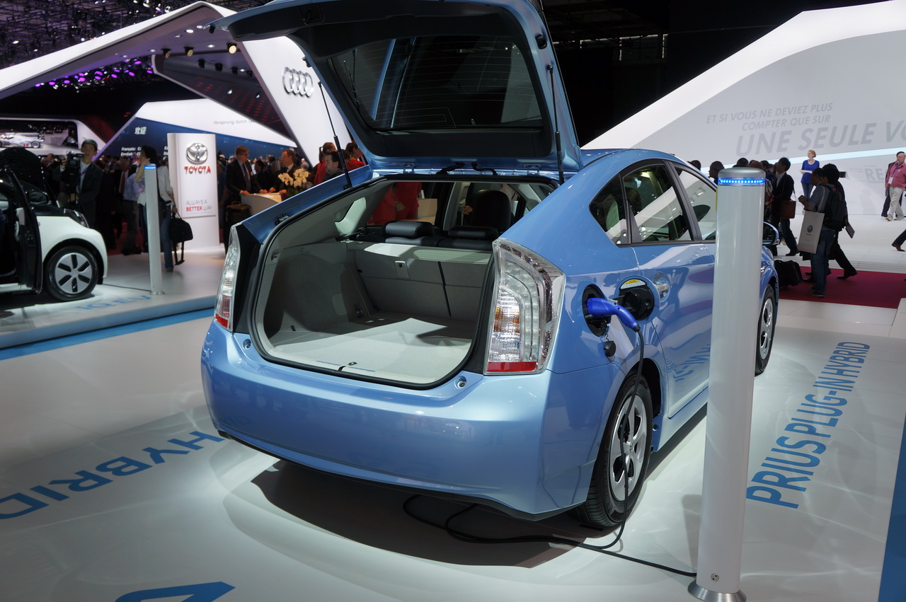 Новый Prius plug-in hybrid. Тоже голубенький, хотя и не на водороде. Дизайн традиционно ужасный - ну, Prius, такой Prius. Зато в режиме электромобиля может разогнаться аж до 100 км/ч и проехать аж до 20 километров. И заряжаться может от обычной розетки, причем за каких-то 1,5-2 часа (это реально немного, многим электрокарам требуется вся ночь).