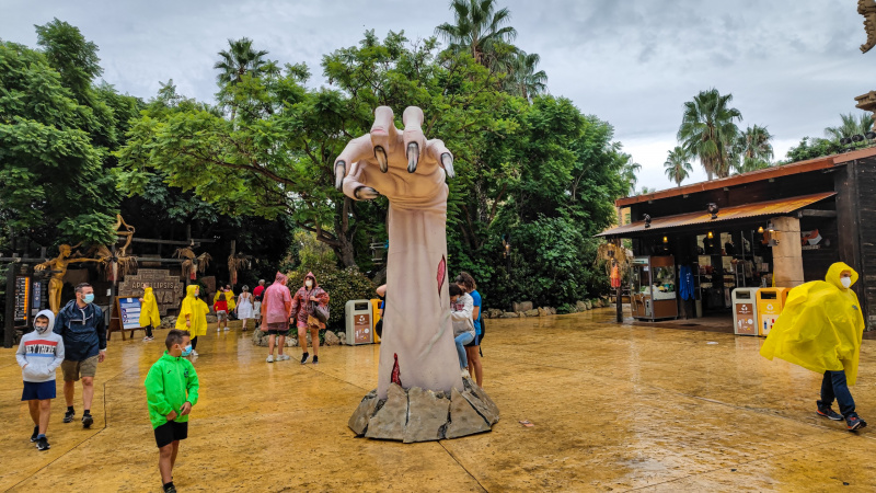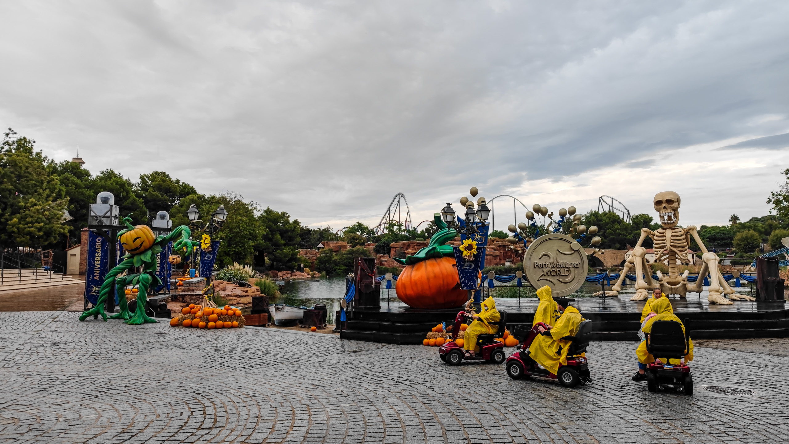 Хмурое небо над ПортАвентурой, идет дождь. Народ покупает дождевики, которые здесь продаются на каждом шагу, и арендует электрокаталки, чтобы рассекать по парку.