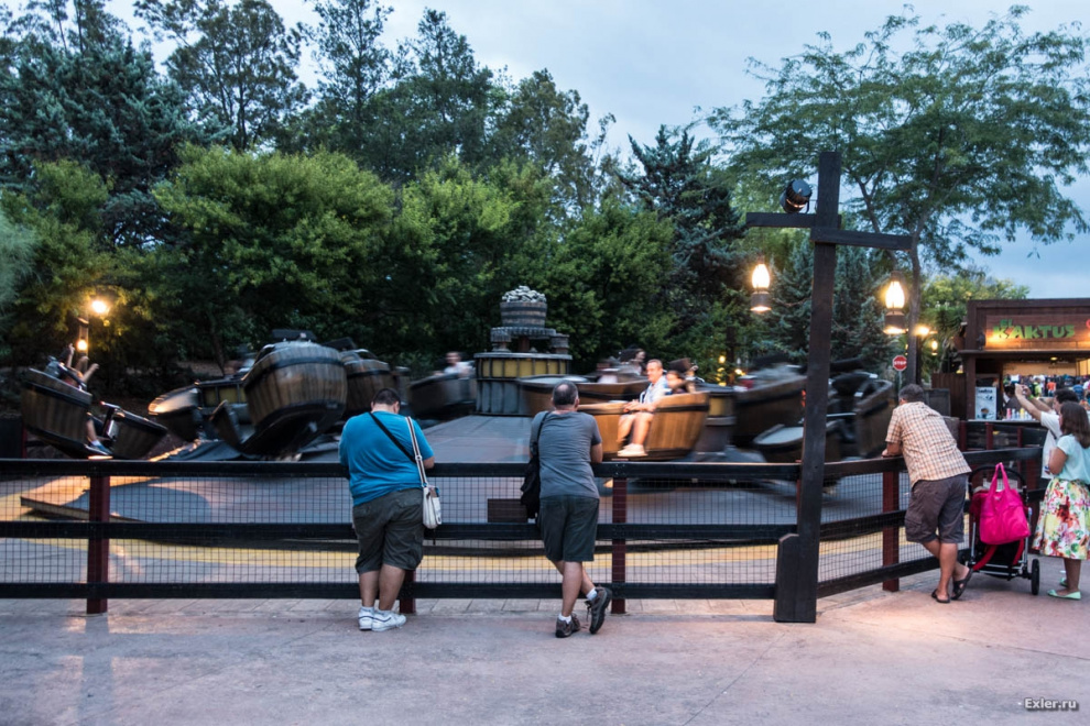 Что удобно - везде расставлены табло, на которых написано, сколько примерно ждать очереди у каждого из крупных аттракционов. На "бочки" надо было стоять 40 минут. (Я где-то видел фото этого табло - там на один из аттракционов надо было стоять 3 часа 20 минут.)