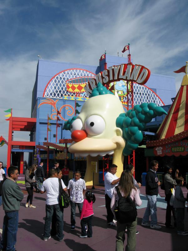 Следующий аттракцион - один из лучших. В него пришлось постоять полчасика. (Это еще по-божески.) Внутри заходите в небольшое помещение, дальняя стена которого целиком является экраном. Садитесь в специальную кабинку, надеваете очки для 3D. После этого начинается совершенно умопомрачительный пролет по миру Симпсонов, причем кабинка при этом раскачивается и трясется, создавая потрясающий эффект присутствия. Пожалуй, этот аттракцион мне понравился больше всего.