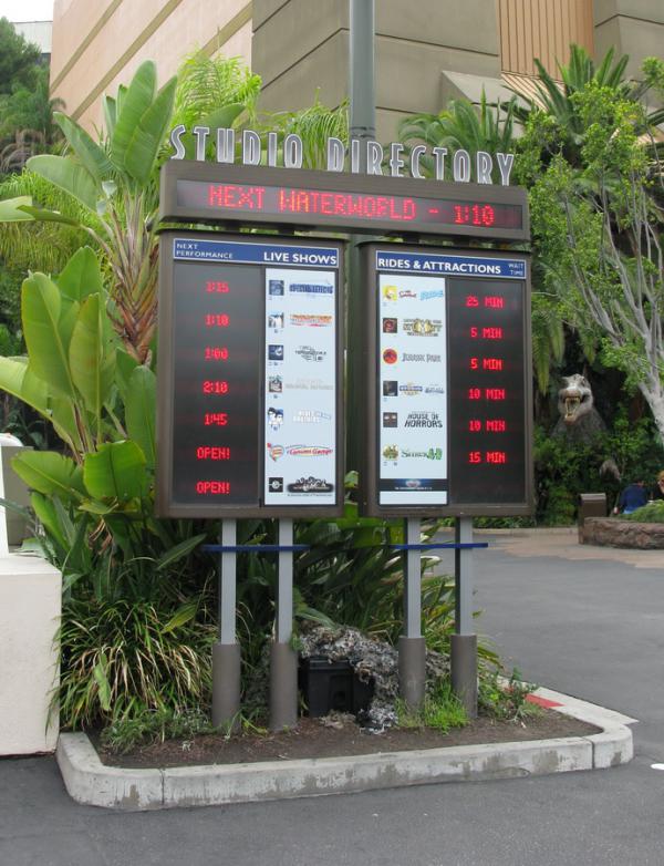 В парке часто попадаются вот такие табло, на которых написано ближайшее время старта различных аттракционов и шоу - можно составить себе расписание.