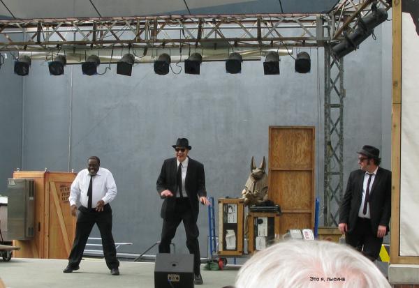 "Братья Блюз" что-то исполняют. На настоящих "Братьев Блюз" не сильно похожи.
