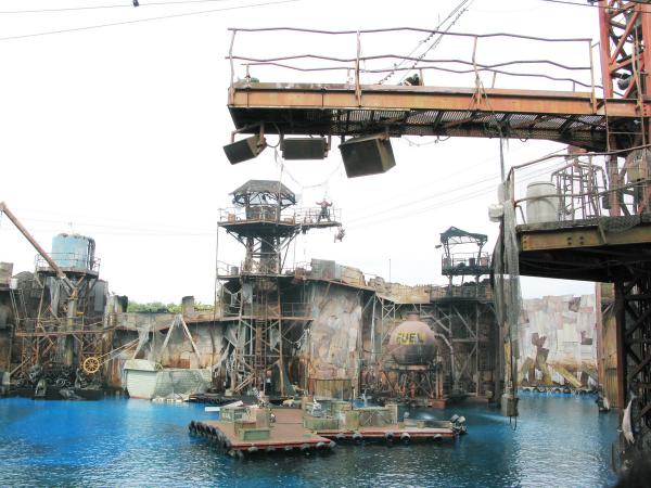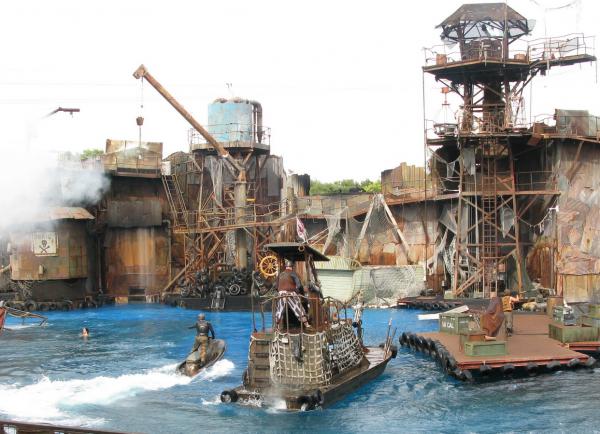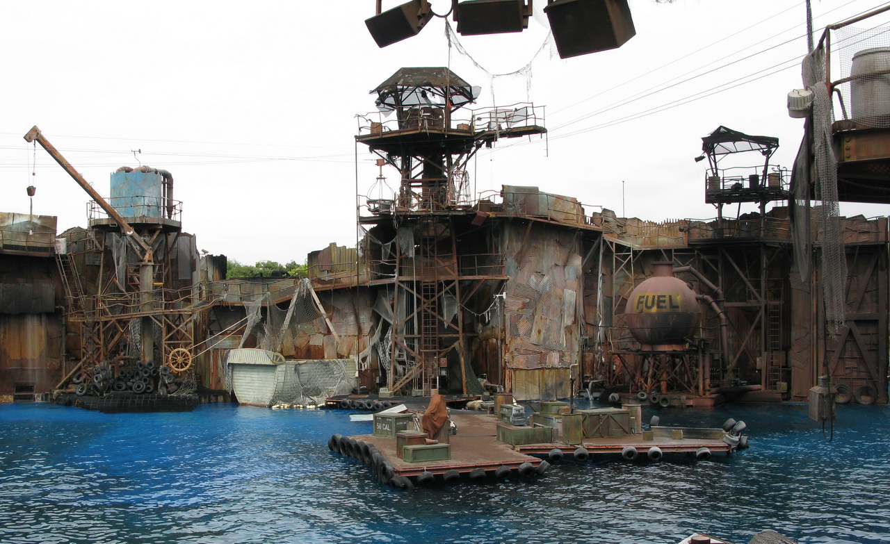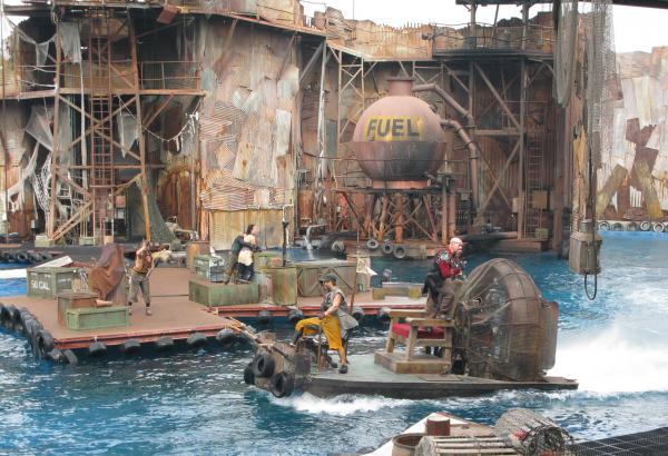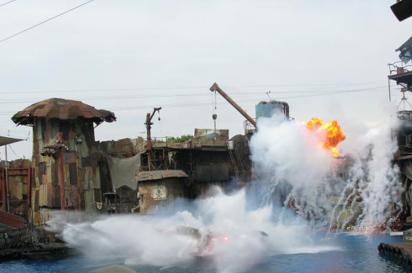 Когда начинается представление, "плохие" и "хорошие" въезжают через ворота на всяких катерочках и водных матациклах, после чего раскатывают по воде, носятся по платформам и вышкам, стреляют друг в друга, разыгрывают простенький сюжет, падают в воду и снова залезают на вышки. Стреляют водой - выглядит это очень забавно.