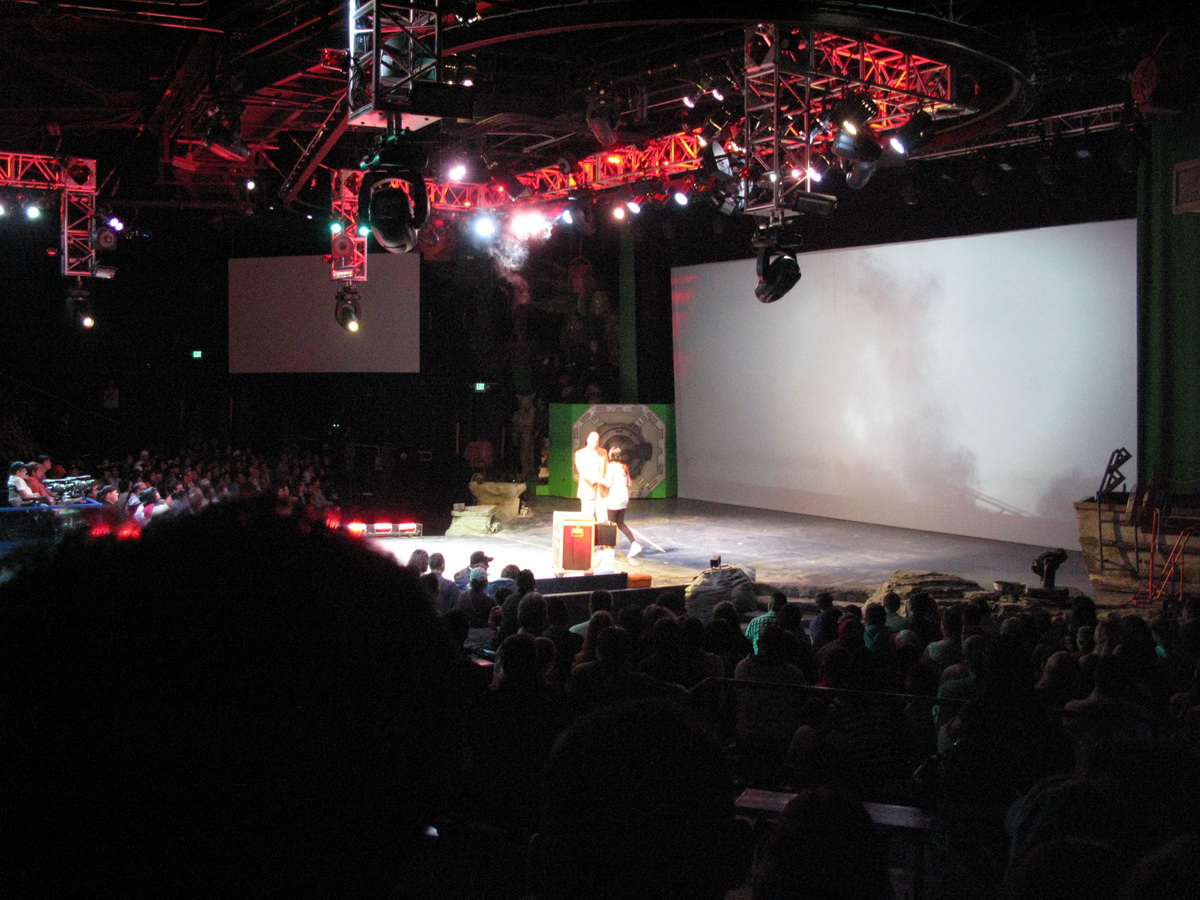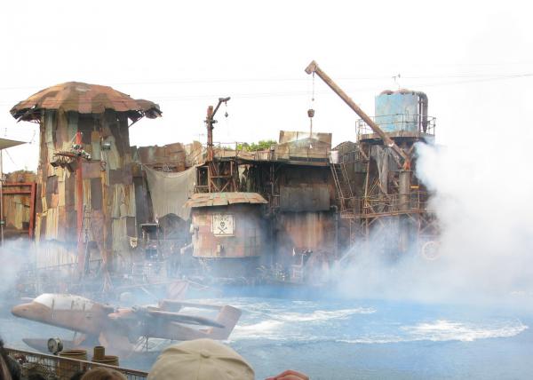 Еще был аттракцион вроде по "Терминатору". Там было не особенно круто, но зато в самом конце что-то взорвали и прямо на зал пошел огромный вал прохладного пара. И через минуту все конкретно заволокло. Это было эффектно.