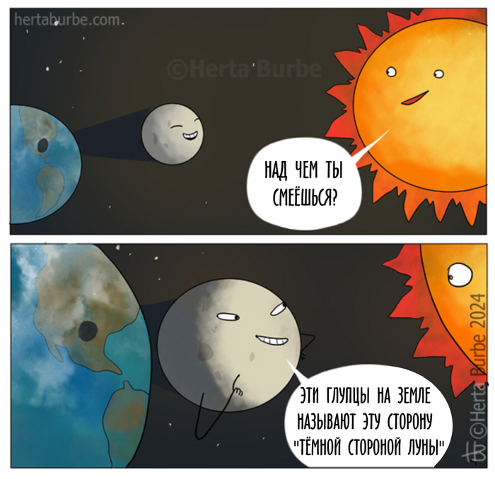 Поэтому он не понял буквально, он реально так считает, что раз обратная сторона всегда в тени от Земли, то значит она всегда в тени и от Солнца.