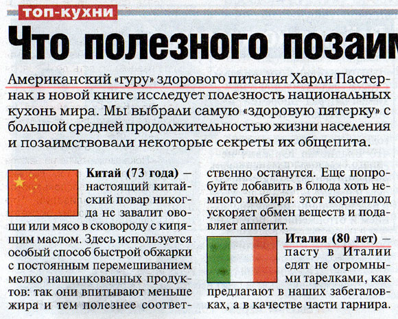 Да и паста в итальянских ресторанах всегда тааакими порциями... Самое интересное - ведь народ-то этой "гуре" поверит, и потом с пеной у рта станет доказывать... да хоть мне, что так именно и есть, как в газетке написано...