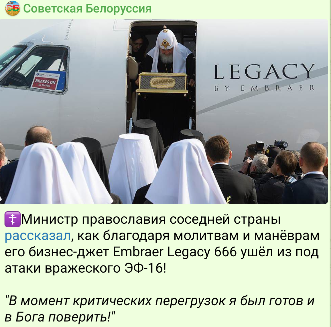 «Какую опасность может представлять патриарх, который летит к своей пастве? И вдруг появляется F-16, грозная натовская машина, и всё приближается к самолету патриарха. Вот это вопрос «на завал» западным политикам: «Для чего вы это делаете? Патриарха не напугаете — это точно!» — подчеркнул патриарх Кирилл, выступая на собрании духовенства Калининградской митрополии в православной гимназии при кафедральном соборе Христа Спасителя в Калининграде.