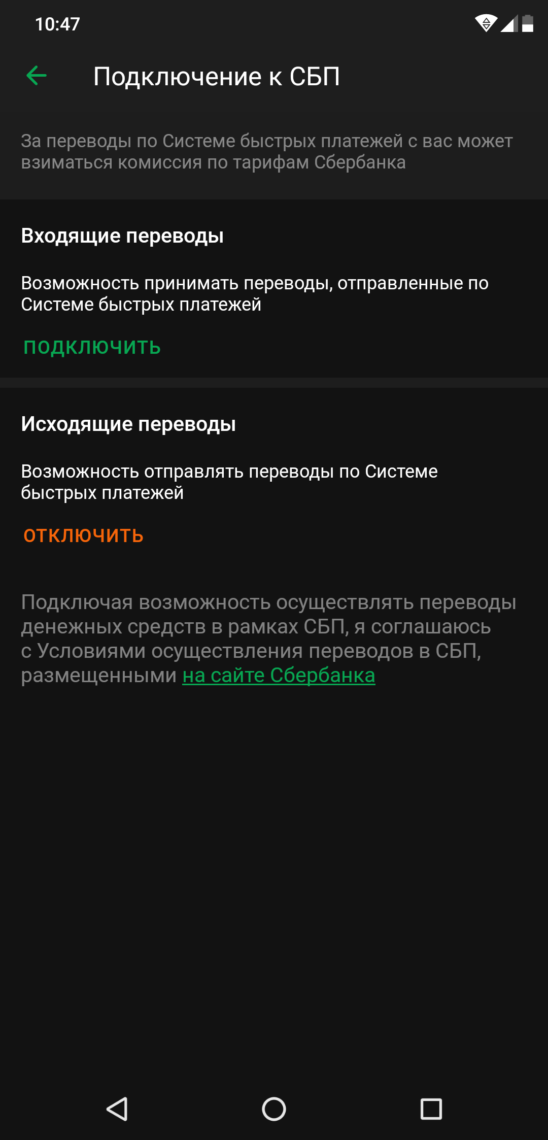 Вообще, нафига было делать выключатель на опцию именно приёма платежей? Ну и запрятан этот переключатель так, что как бы намекает, что Сбер не горит желанием осуществлять переводы через СБП, и его принудили к этому. Оно и понятно: бесплатные переводы внутри сбера лимитируются 50К, а потом 1%, а через СБП 100К и потом 0,5%.