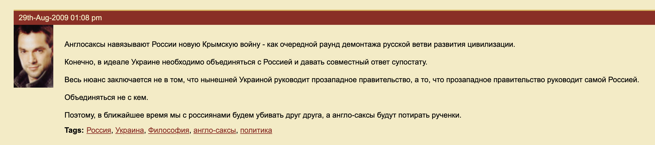 отсюда и вся его нелюбовь к Западу и "любовь" к той стране и дугинам и пр.