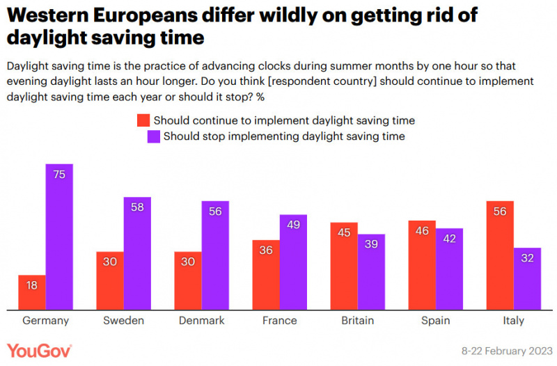 Немцы чаще других хотят отменить переход на летнее время - 75% по сравнению с 18%, которые хотят его сохранить. Большинство жителей северных соседей Швеции (58%) и Дании (56%) также хотят отказаться от перехода на летнее время, как и французы - 49% против 36%.