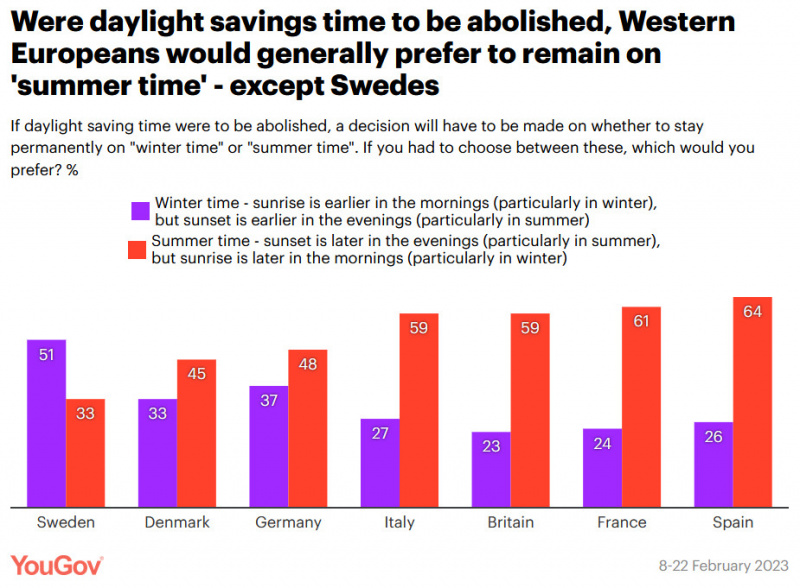 Если бы переход на летнее время был отменен, необходимо было бы принять решение о переходе на "летнее" или "зимнее" время. По крайней мере, в этом вопросе наблюдается более очевидное согласие между странами - все, кроме Швеции, хотят остаться на летнем времени, предпочитая более поздний закат солнца по вечерам за счет более позднего восхода по утрам. Особенно большое предпочтение отдается Испании, Франции, Великобритании и Италии (59-64% за летнее время против 23-27% за зимнее).