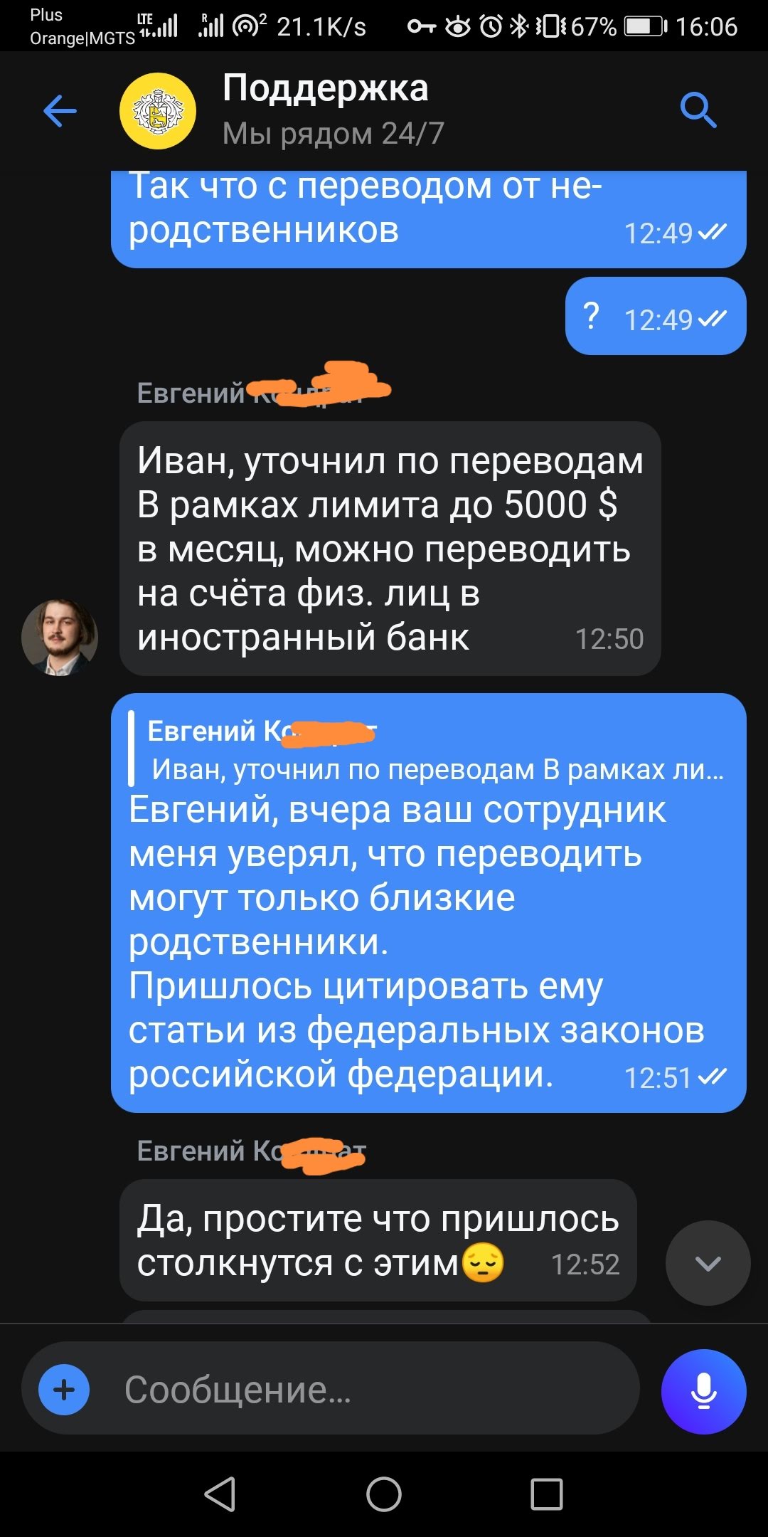 Иван, а вы не могли бы ссылки на конкретные нормы закона подсказать? Меня в марте тинек как раз развернул с переводом не-родственнику зарубеж, и вроде как по закону о валютном регулировании все совпадало (их аргументация).